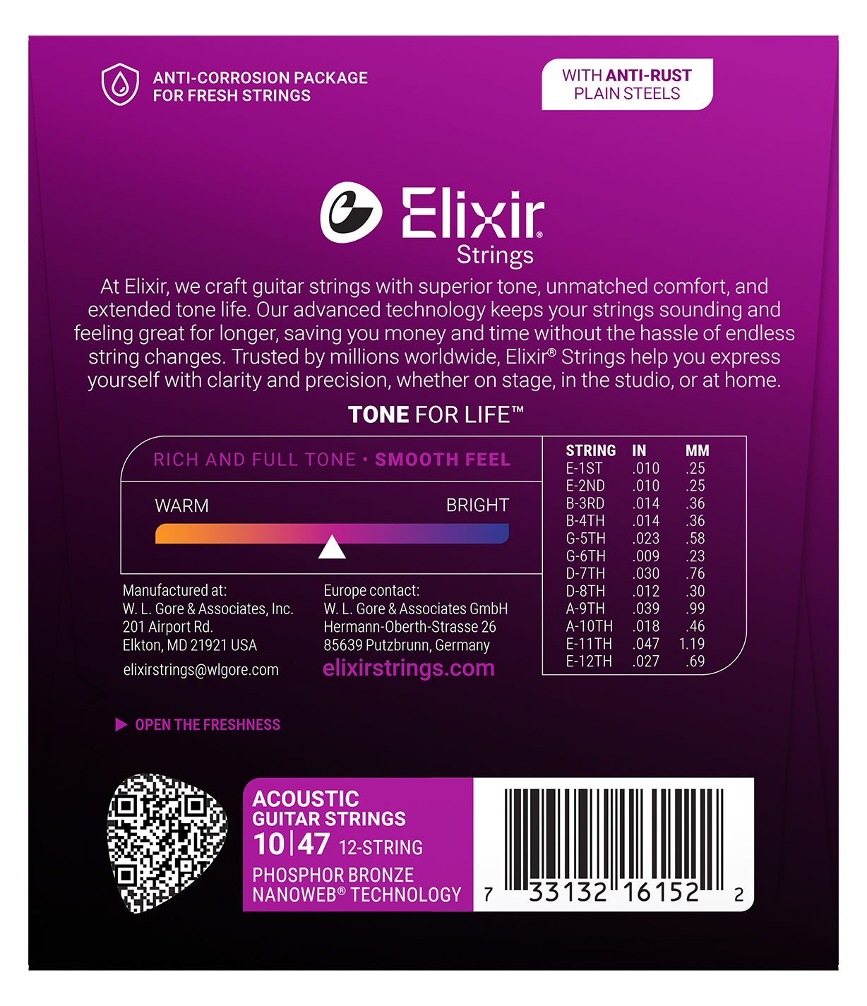 Komplet do gitary akustycznej lub elektro-akustycznej 12-strunowej. Odpowiednio dobrane przekroje poszczególnych strun zapewniają komfort i wygodę gry oraz doskonałe brzmienie strun Elixir.